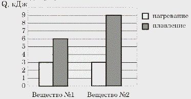 8. На диаграмме для двух веществ приведены значения количества теплоты, необходимого для нагревания 1 кг вещества на 10 °С и для плавления 100 г вещества, нагретого до температуры плавления. Сравните удельную теплоту плавления (?1 и ?2) двух веществ.